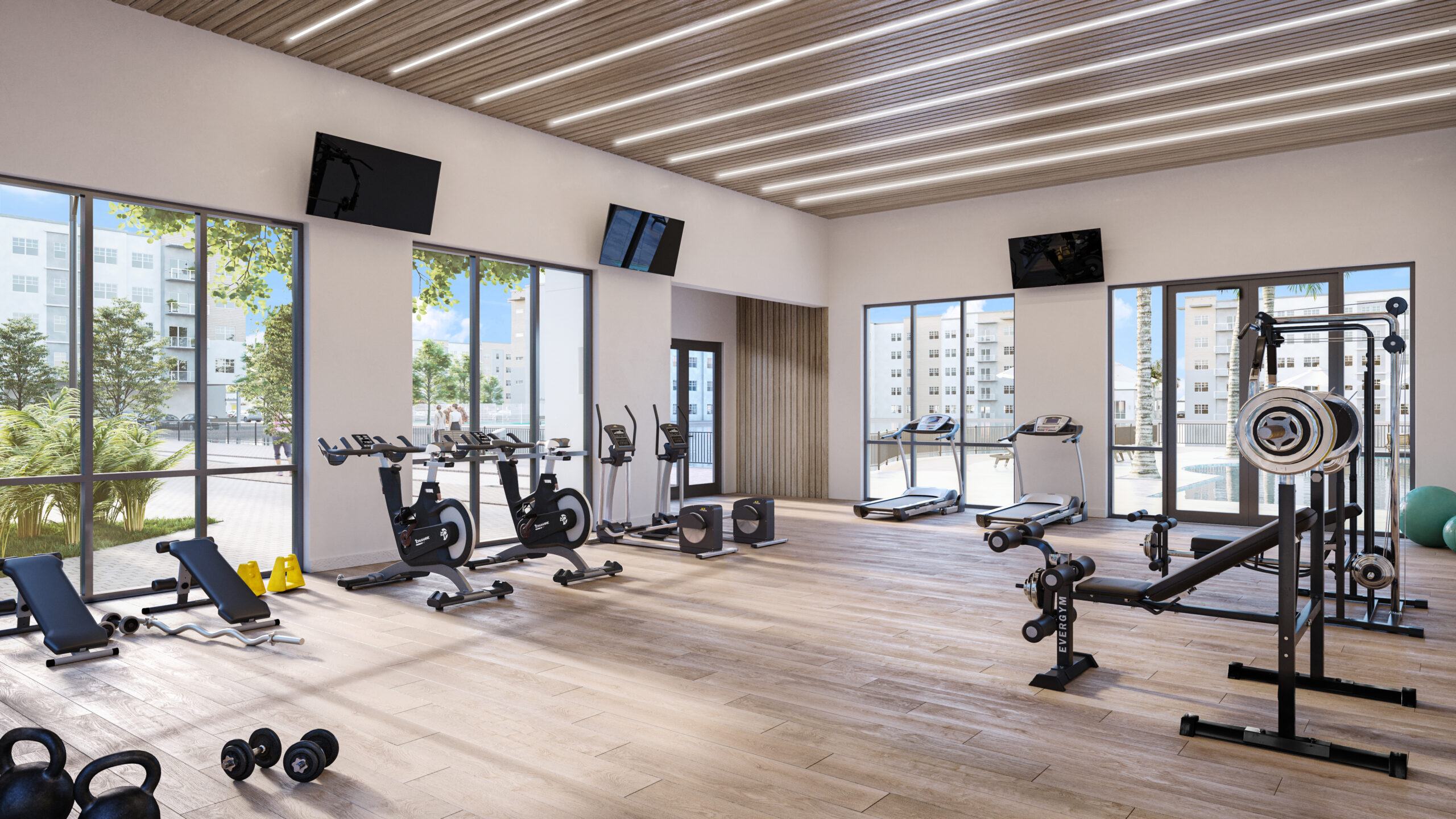 Son 8 torres y cinco niveles para un total de 960 unidades de apartamentos de una, dos y de tres habitaciones. Además, incorporará cuatro piscinas, cuatro gimnasios, parques, casas club, canchas de tenis, caminerías a orillas de un lago, tiendas… ¡será como vivir en una miniciudad con el HOA (administración) más baja de todo Orlando!