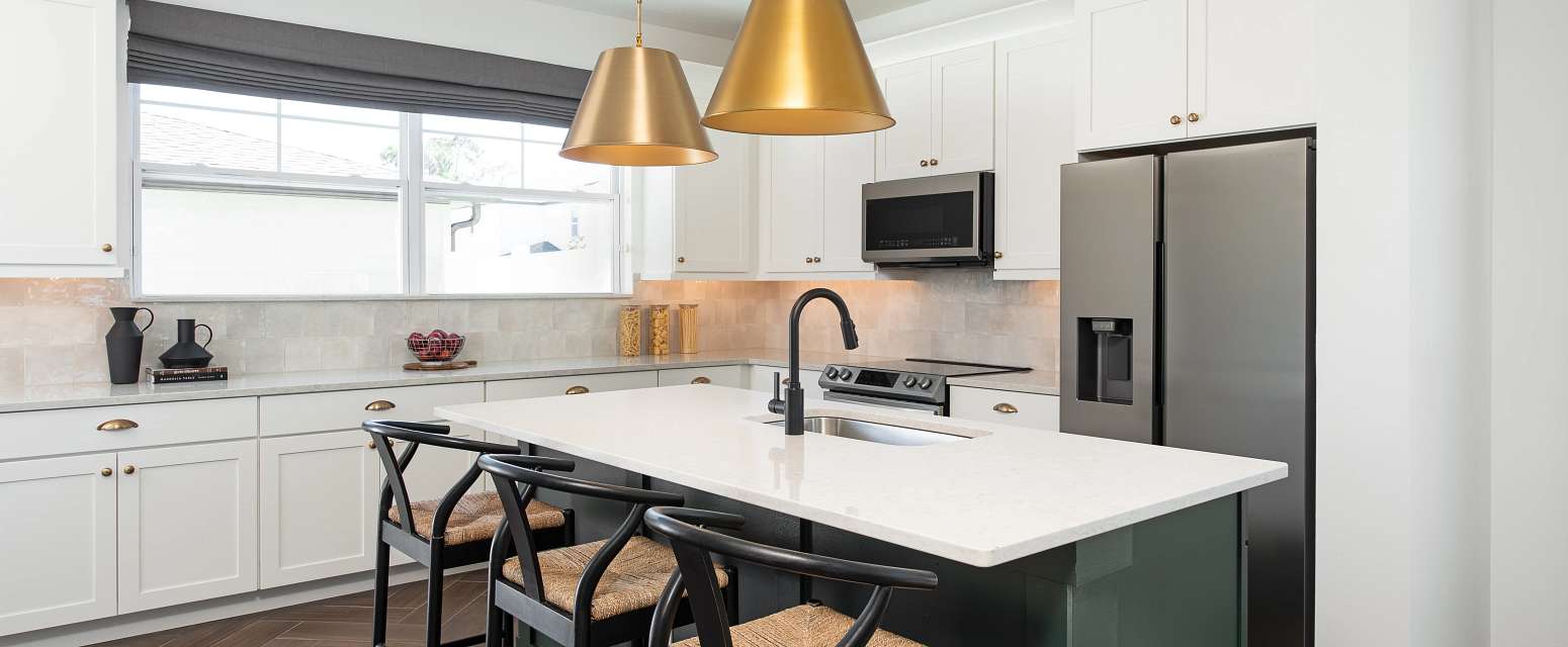 Planta principal: una cocina de ensueño con isla central y despensa «walk-in» que se integra perfectamente con el comedor y la sala familiar. El espacio perfecto para manifestar momentos inolvidables con amigos y familia.